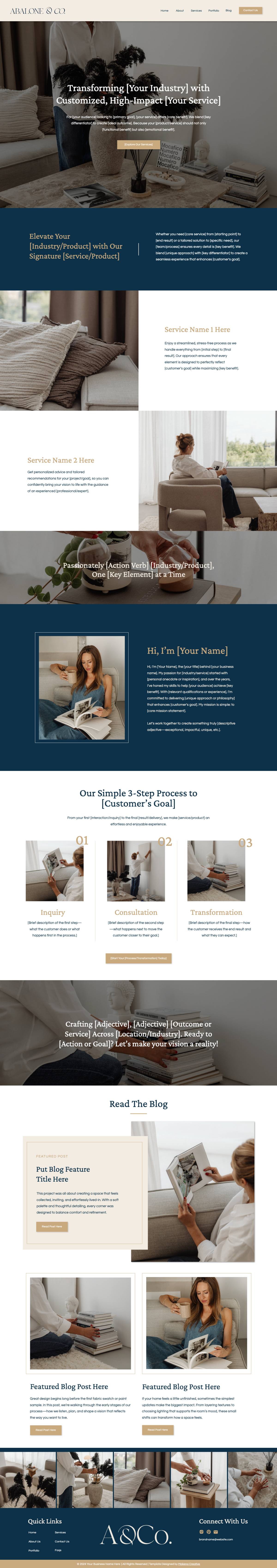 Abalone & Co. is a modern, minimal website template designed with interior designers in mind. It features a clean layout that lets your personality shine through curated imagery and thoughtful design, without overwhelming features or complicated customization. With its refined structure and flexible style, it’s easy to make your own—perfect for creatives who want a sleek, professional online presence that still feels personal.