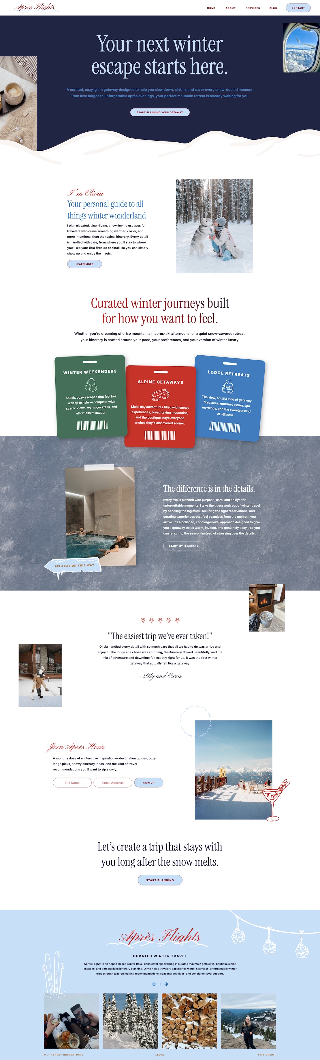 Built for travel advisors, planners, and experience-driven creatives, Après Flights pairs layered layouts, custom illustrations (hello ski passes), and smooth canvas transitions to create a site that feels immersive, polished, and memorable. Your destinations shine, your expertise leads the way, and every detail works together to guide visitors from inspiration to inquiry with ease.