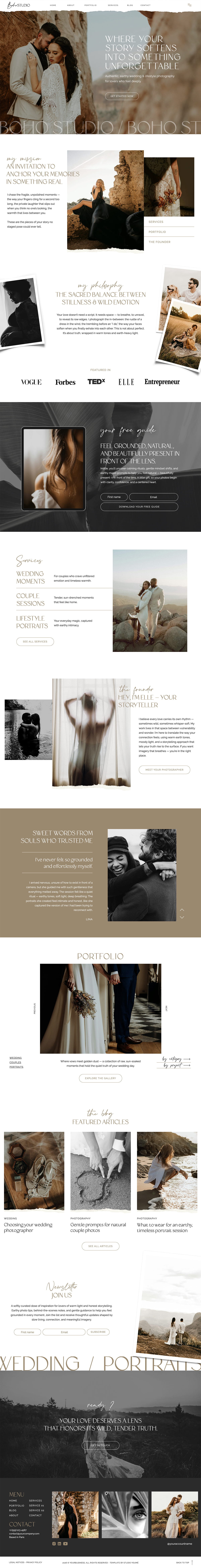 Boho, elegant and soulful, this template was crafted for photographers and creative professionals who want to create an emotional connection and turn visits into inquiries. Ideal for photographers, artists, wedding professionals, videographer and brands driven by storytelling and atmosphere, it offers a strong yet subtle online presence that highlights both vision and sensitivity.