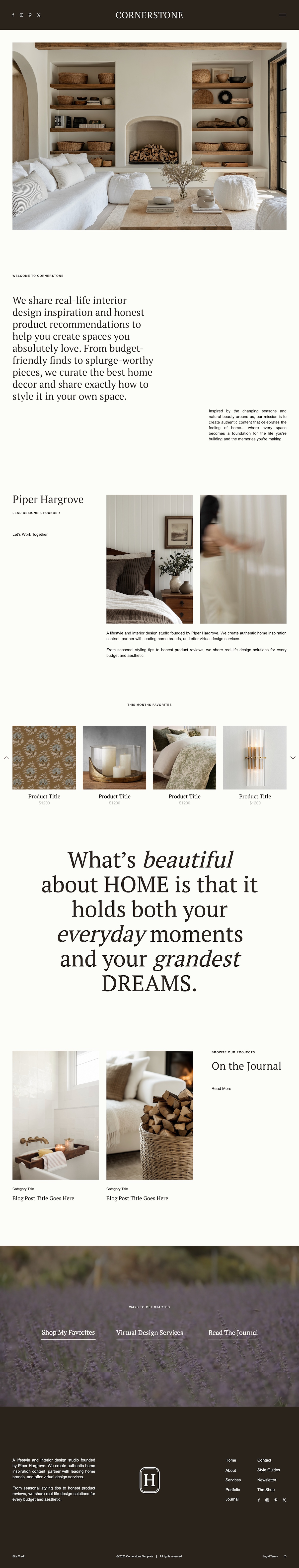 Cornerstone is an editorial Showit website template designed for interior designers building a refined, high-end studio presence. The design is architectural and minimal, with intentional white space and a calm, considered layout that allows your work to take center stage. Every section is structured to feel elevated, timeless, and quietly confident—without relying on trends or visual noise. Cornerstone is ideal for established and scaling interior designers who want their website to reflect the same level of thought, restraint, and professionalism they bring to their projects. Layouts are designed to guide visitors through your work, establish credibility, and support high-touch inquiries — ideal for designers booking full-scale projects.