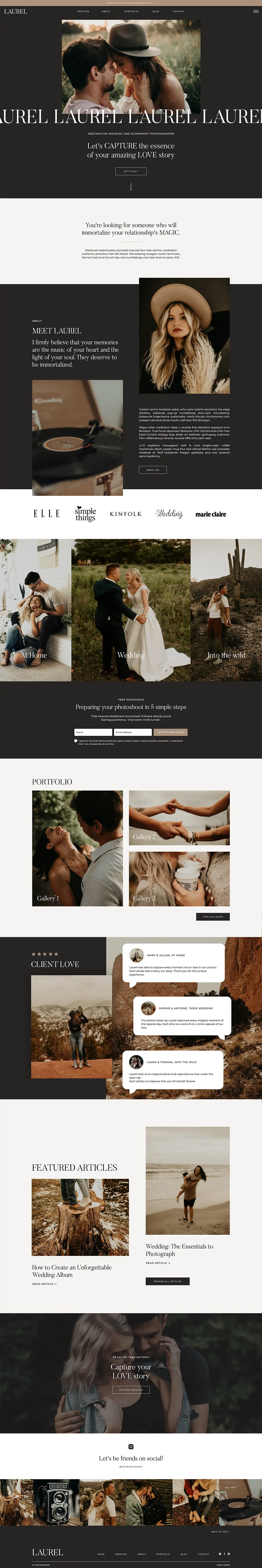 Introducing Laurel, the quintessential template crafted exclusively for talented photographers, meticulously designed to accentuate and spotlight your stunning photographs. With its timeless elegance fused seamlessly with a modern flair, Laurel serves as the perfect canvas to exhibit your artistic vision and unique style. Every element exudes sophistication, inviting viewers to immerse themselves in the captivating world of your photography. With Laurel, charm and allure prospective clients effortlessly, leaving a lasting impression with your exceptional portfolio.