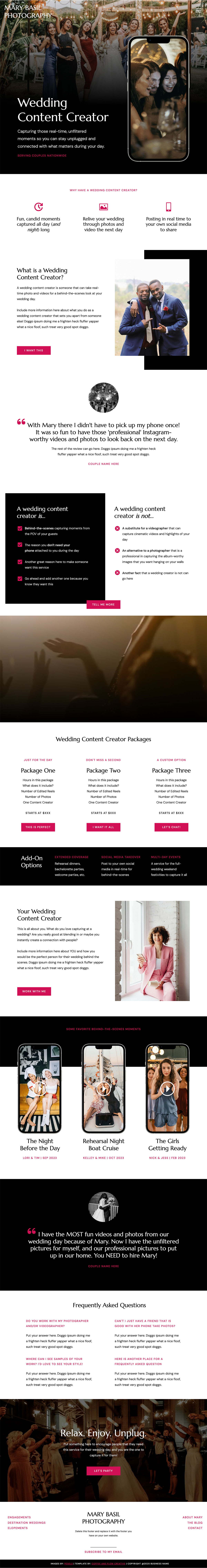 This Wedding Content Creator page is designed for the photographer that is looking to add a more detailed page about this service to their website. The style can easily match a classic photographer website with all the sections needed to explain why a client needs the wedding content creator service.